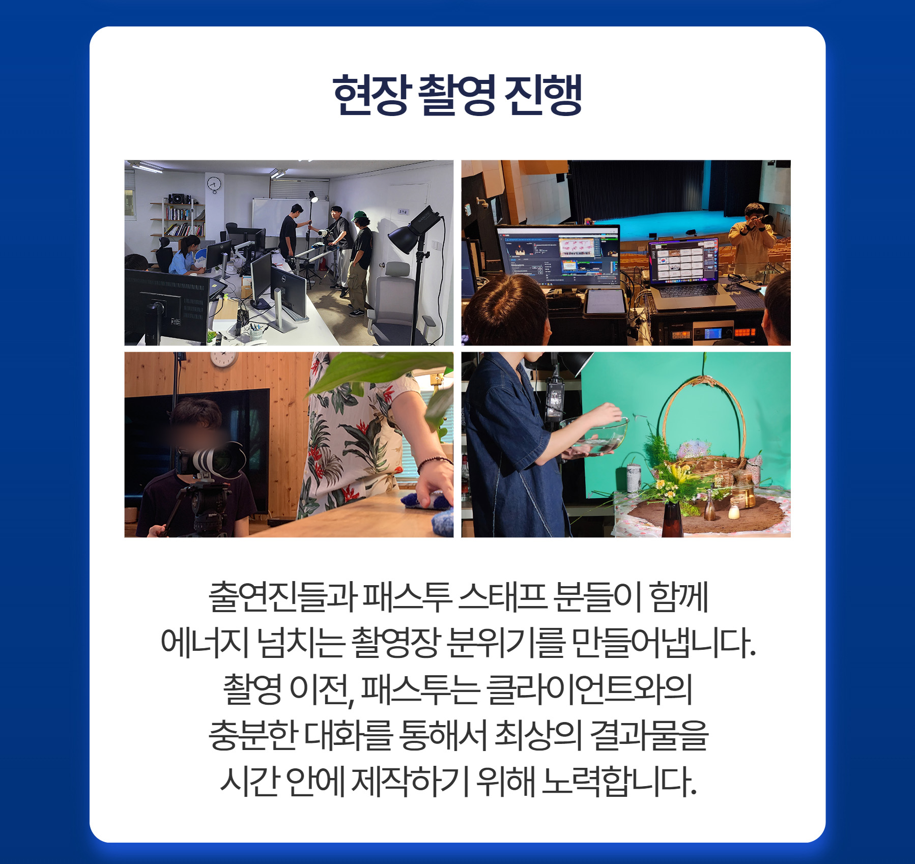 프리 프로덕션 단계를 마친 후, 본격적인 프로덕션 단계에 돌입합니다. 👀 이 단계에서는 모든 준비 작업이 실제 촬영으로 이어지며 아래와 같은 과정을 거칩니다. 패스투는 이러한 체계적이고 철저한 프로덕션 과정을 통해 고퀄리티의 콘텐츠를 제작합니다. 현장 촬영 단계에서의 꼼꼼한 준비와 실행이 성공적인 결과물을 만들어내는 핵심 요소입니다.