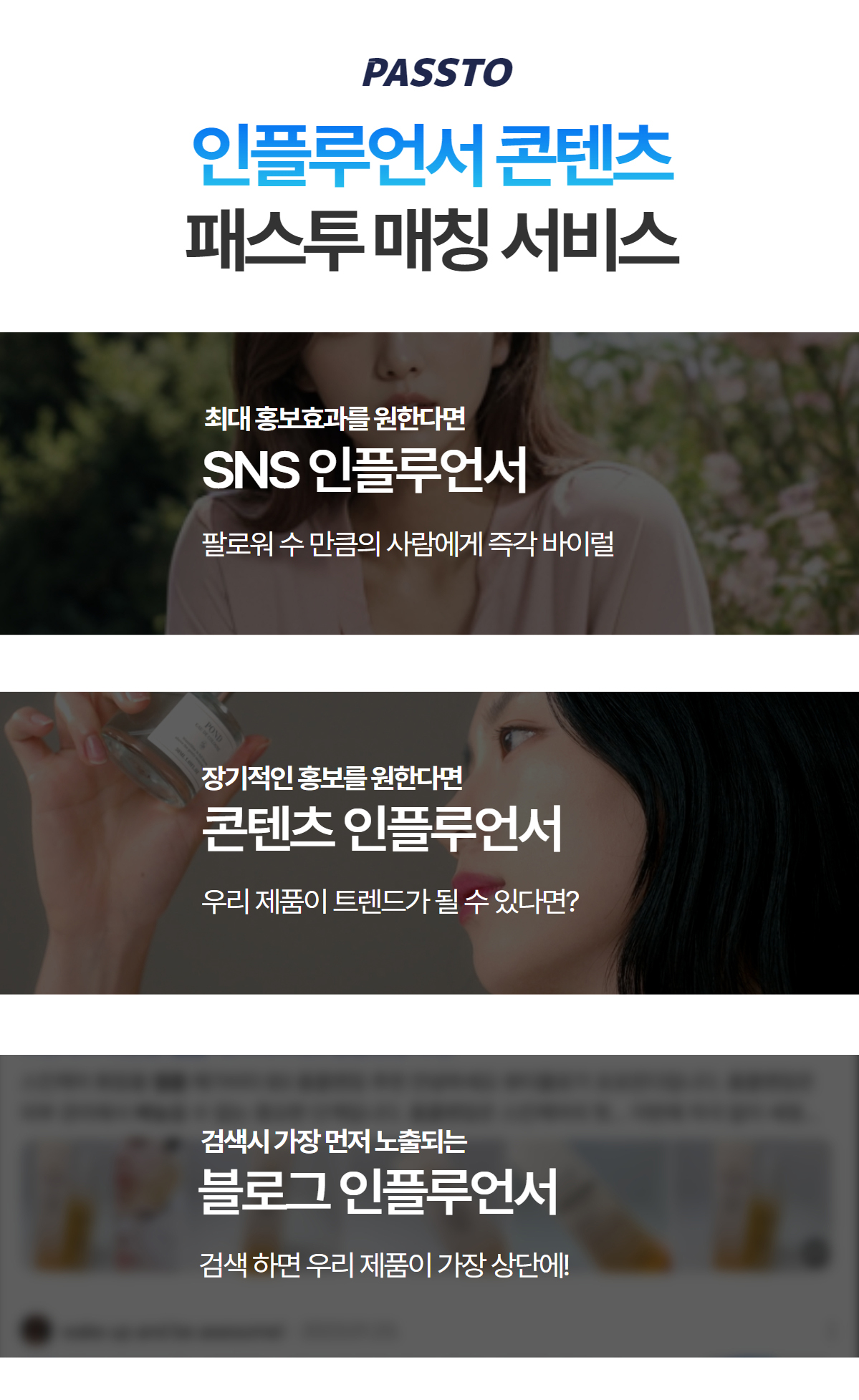 패스투는 브랜드 맞춤형 인플루언서 매칭을 진행하고 있습니다. 인플루언서의 영향력, 이미지 등을 고려하여 목표 성과에 도달할 수 있는